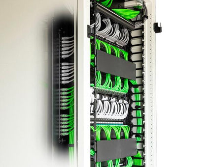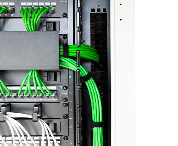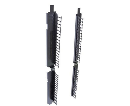 This vertical cable management accessory is designed for efficient cable support and organization, featuring integrated plastic fingers along the vertical edge. It is compatible with 31.5” wide network cabinets and constructed from durable, powder-coated cold rolled steel in black. The unit includes brush panels that help manage airflow and can be replaced with 1U patch panels to expand connectivity capacity. It is available in multiple heights, including 42U, 45U, 48U, and 52U, offering flexible options to suit various network configurations.