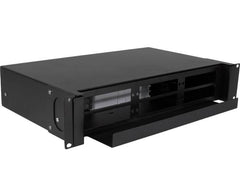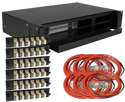 This rack mount fiber optic patch panel is a 2 Rack Unit (2U/2RU) high density fiber distribution unit that Includes fiber optical OM1 Multimode Pigtails, LGX LC adapter panels and six 24 fiber splice trays. This panel also includes a smooth sliding drawer type pull out system.