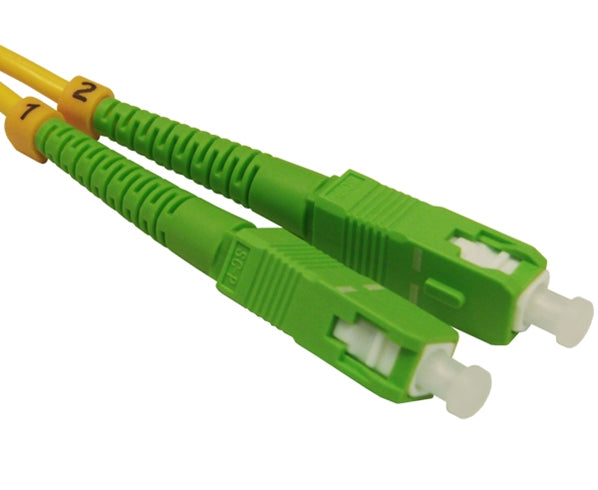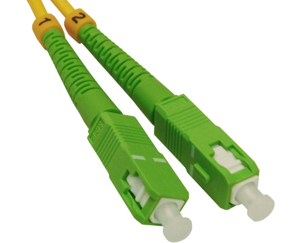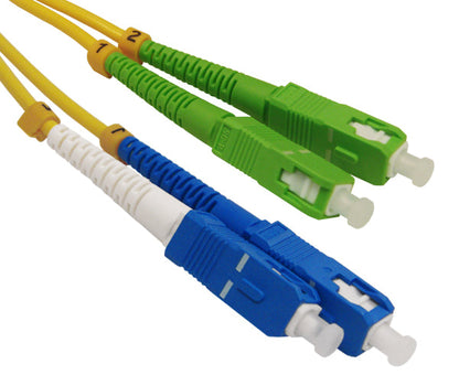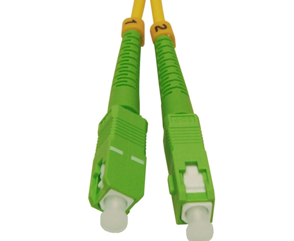 These high speed singlemode 9/125µm duplex fiber optic patch cables are terminated with SC/UPC fiber optic connectors on one end and SC/APC fiber optic connectors on the other end (SC/UPC-SC/APC). Referred to as Subscriber Connectors, Square Connectors or Standard Connectors, these push-pull connectors are the most common choice for FTTH (fiber to the home) applications in use for Datacom and Telcom; most GBIC modules also require this connector type.