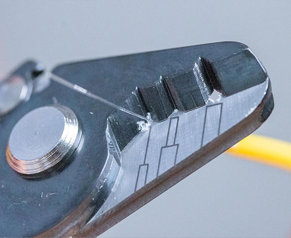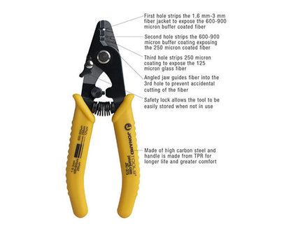 - Strips the 1.6 mm-3.0 mm fiber cable jacket, 600-900 micron buffer coating, and 250 micron acrylate coating to expose the 125 micron glass fiber