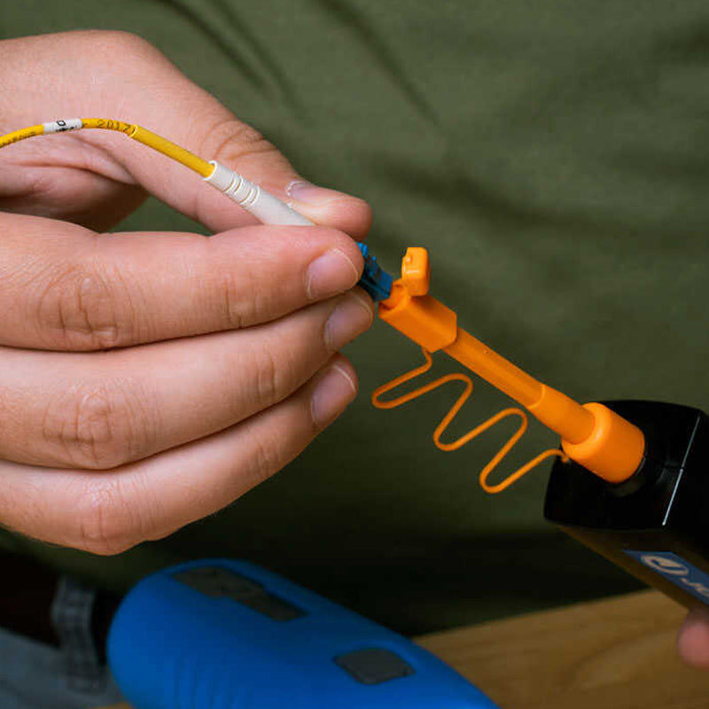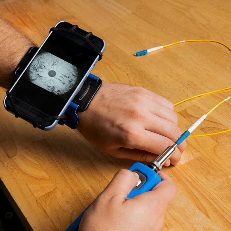 This portable Wi-Fi end-face probe provides clear high-resolution images of fiber optic connector ferrules in real time on a smart mobile device or tablet. It also features a One Press automatic analyze function, which automatically generates and records a Pass/Fail report.